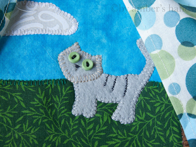 I think my favorite is the first page, the one with the window & the cat. It was actually the last one I came up with, and I was kind of stuck. I had 9 pages that I had no trouble coming up with ideas for, but I needed one more. I actually didn't get the idea until I was at the fabric store, looking at different materials. I think the cat ended up cute, and the window was something I hadn't seen in other quiet books. I ended up having to make a change to it later, because my original materials didn't hold up. But it was a simple fix (I don't know why I didn't think to do it that way in the first place!) and I think it should last for a long time.